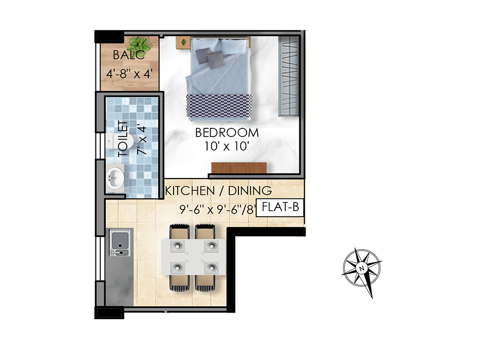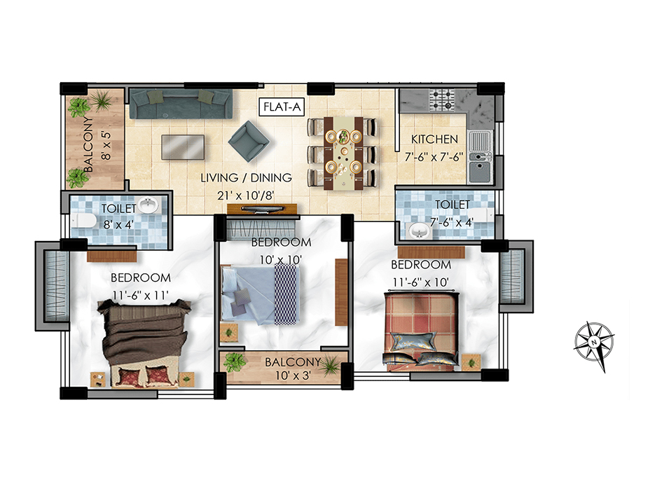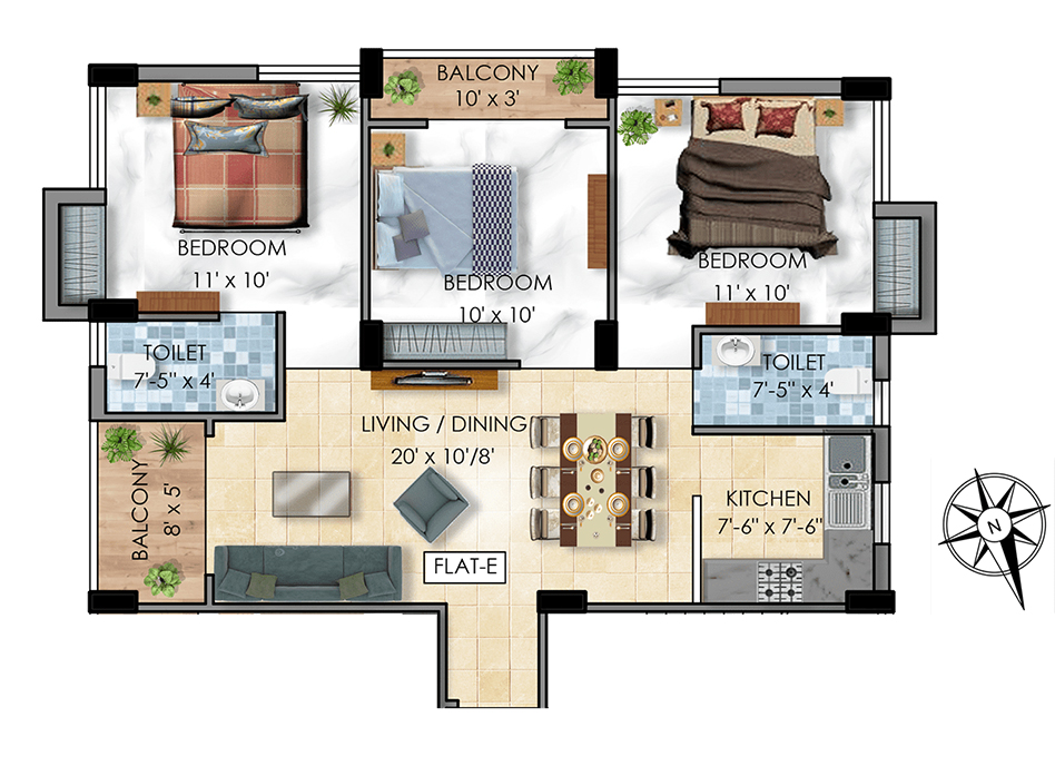 | Floor | Vitrified Tiles in Living/Dining & Bedrooms |